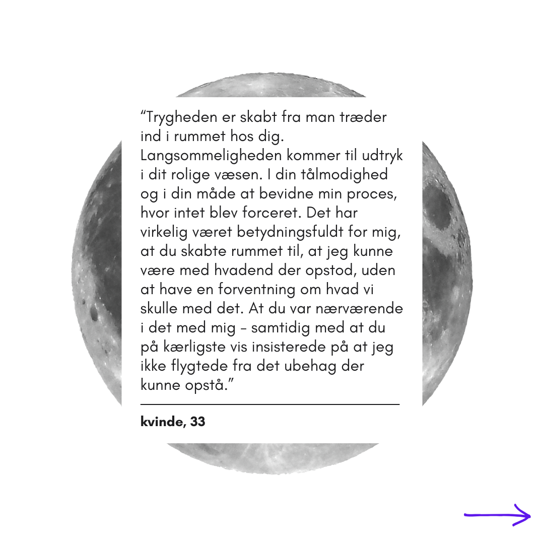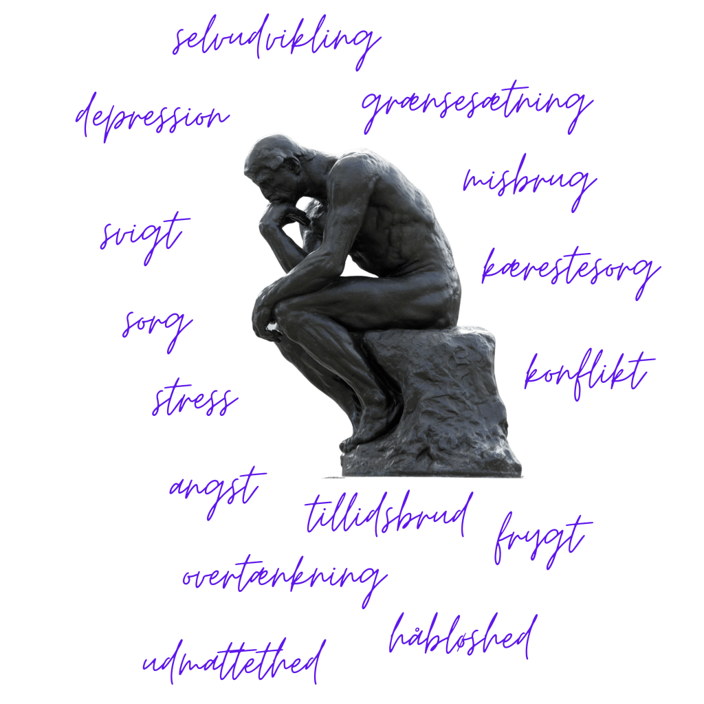 Jeg glæder mig til at møde dig og skabe rum for netop det, som du ønsker at arbejde med i terapi. I et trygt rum arbejder vi med det, der fylder for dig og bevæger os i dybden med dine følelser, udfordringer og behov. I vores fortrolige samtaler får du mulighed for at fordybe dig i vigtige områder af dit liv samt at forstå og forandre de bevidste og ubevidste mønstre og overbevisninger, som kan være med til at fastholde dig i en tilstand, du ønsker at ændre. I terapien støtter jeg dig i at forstå og fordybe dig i dine følelser for derigennem at skabe vigtige forandringsprocesser.